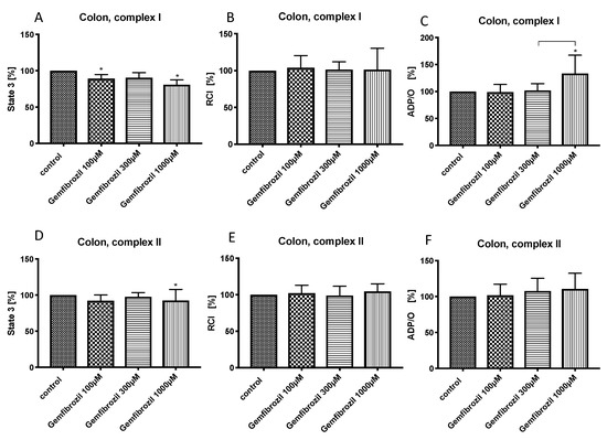 Gemfibrozil in low concentration (100 µM) reduced state 3 for complex I (89.3% ± 5.5%*). Gemfibrozil at the middle concentration (300 µM) did not show any effect on colonic mitochondrial respiration. Gemfibrozil at high concentration (1000 µM) reduced state 3 for both complexes (complex I: 80.8% ± 6.6*, complex II: 92.5% ± 15.2%*) and increased the ADP/O-ratio for complex I (133.8% ± 33.8%*) without changing the RCI (Figure 4B,E).
