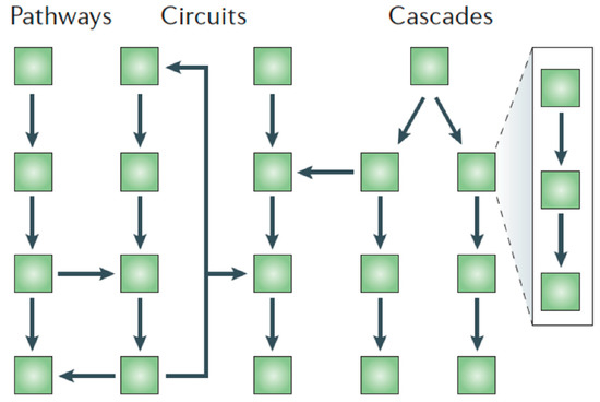 The “protease web”, in which proteases act in linear pathways, amplification cascades (with a one-way flow of information), or in circuits (with information feedback) [33]. Figure reproduced with permission of the Nature Publishing Group.