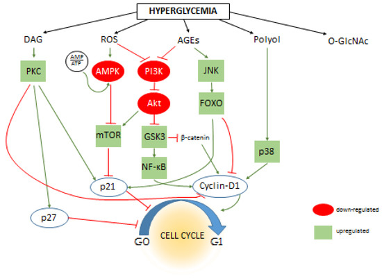 The effect of hyperglycemia on intracellular signaling pathways and cell cycle regulation. The primary metabolic changes caused by excess amount of intracellular are increased levels of diacyl-glycerol (DAG), reactive oxygen species (ROS), advanced end-glycation products (AGEs), sorbitol (Polyol), and protein O-Glycosylation (O-GlcNAc). Dozens of secondary messengers and signaling elements are activated (or de-activated) that are connected to the cell cycle regulatory system and eventually influencing cell proliferation by either directly influencing cyclins, cyclin-dependents kinases and cell cycle inhibitors such as p21 or altering their expression level through influencing transcriptional activity. The figure shows some of these connections; positive or negative effects inherent to the interactions are indicated by green or red lines between proteins, respectively. The effect of hyperglycemia (if it is known) on the activity of individual signaling elements are indicated by green (up-regulation) or red (down-regulation) background coloring. For clarity, the connections of O-GlcNAc are omitted from this figure, however please note that increasing number of evidences suggest that the majority of intracellular signaling elements are modified and influenced by O-GlcNAc modification.