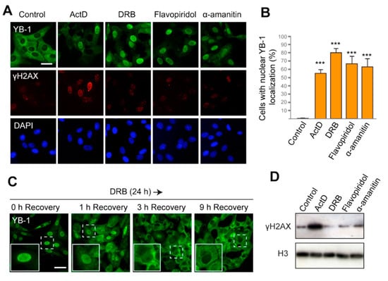 Several studies have shown that DNA-damaging drugs could provoke the nuclear translocation of YB-1 in several cell lines [24,26,42,43]. Additionally, a higher level of nuclear YB-1 was detected in samples from patients with advanced cancer who were undergoing chemotherapy [27,44,45]. These observations evidenced that damaged DNA could trigger YB-1 translocation to the nucleus. Importantly, the drugs used in these studies, apart from their DNA-damaging ability, may also affect the transcriptional activity of the cell [46]. Therefore, we aimed to reveal whether the nuclear accumulation of YB-1 results from the drug-induced DNA damage and/or it is a consequence of the induced transcriptional arrest.
