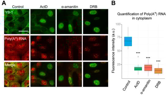 YB-1 is one of the most abundant mRNA-binding proteins in the cytoplasm; it binds to mRNA with high affinity and participates in the regulation of its translation and stability [1,2]. Changes in mRNA distribution can strongly affect the YB-1 localization, as demonstrated by YB-1 re-localizing into stress granules when the cells are exposed to oxidative stress (Figure S3A, Supplementary Materials) [53]. In this aspect, inhibition of transcription may have a dramatic impact on mRNA distribution within the cell, thereby potentially contributing to changes in the localization of YB-1. Therefore, we evaluated the dynamics of mRNA distribution in the cell in our experimental conditions. We performed in situ hybridization using fluorescently labeled oligo(dT) probes recognizing poly(A) tails of mRNAs. Interestingly, when the cells were treated with ActD, DRB, or α-amanitin for 24 h, we observed a strong decrease in poly(A+)mRNA levels in the cytoplasm (Figure 2A,B). Indeed, the median half-life of mRNA is about 12 h, as measured in mammalian cells [54], which indicates that more than 50%–70% of mRNAs should be degraded after 24 h transcription blockage. At the same time, no visible decrease of ribosomal RNA levels was detected under these conditions, which can be explained by greater stability of RNA, as compared to mRNA (Figure S3B, Supplementary Materials). Therefore, this experiment revealed that the degradation of mRNA in the cytoplasm correlates with YB-1 translocation to the nucleus.