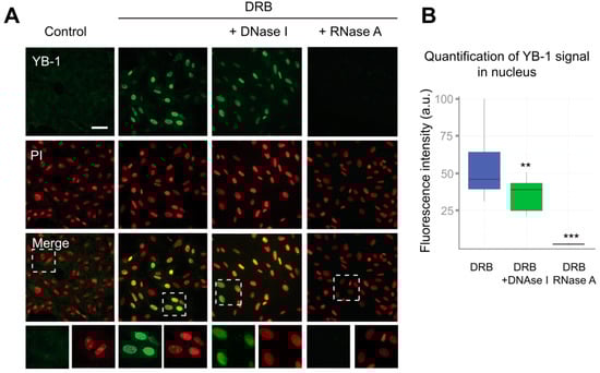 RNA is required for the retention of YB-1 in the nucleus. (A) Control (DMSO-treated) Vero cells or cells exposed to DRB for 24 h were washed with CSK buffer prior to fixation. In the case of DRB-treated cells, either DNA or RNA was additionally digested with DNaseI or RNaseA, respectively. Scale bar 50 μm. (B) Quantification of retention of the YB-1 signal in the nuclei of cells treated with DRB that were freshly permeabilized or treated with DNaseI or RNaseA. Results are mean ± SD. ** p < 0.01, *** p < 0.001, paired t-test; n = 15 for each condition.