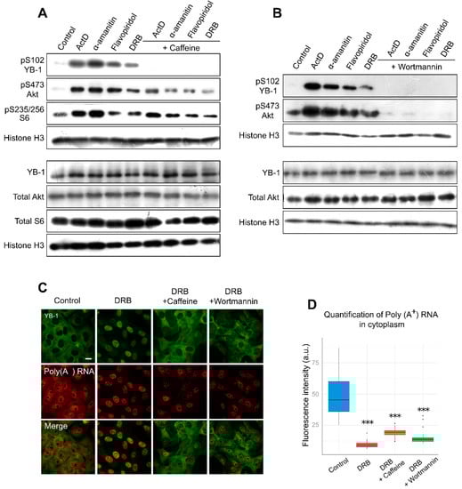 It is known that Akt is one of the kinases that are responsible for YB-1 phosphorylation at Ser102 [35,38]. With the inhibited transcription, we observed an activation of Akt kinase, which correlated with YB-1 phosphorylation (Figure 4A,B). Interestingly, the simultaneous presence of DRB and wortmannin (PI3K/Akt pathway inhibitor) reduces YB-1 phosphorylation and nuclear accumulation without affecting the mRNA level in the cytoplasm. These results are in good agreement with the caffeine effect, so we can speculate that Akt might be responsible for YB-1 phosphorylation and nuclear accumulation upon transcription inhibition. Of note, wortmannin can inhibit not only Akt but also some other kinases [58]; therefore, we cannot rule out their involvement in this process.