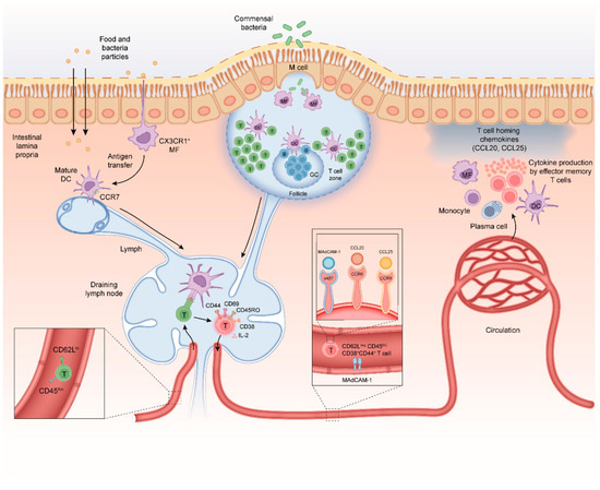 Homing of memory-phenotype CD62LloCD45ROCD44+CD4+ T-cells to the intestine is tightly regulated. In response to signals from the APC and stromal cells in the MLN the differentiating CD4+ T-cells up-regulate expression of the integrin α4β7 and the chemokine receptor CCR9 [27,28]. Intestinal APC-derived retinoic acid is a crucial factor promoting induction of α4β7 and CCR9 on responding CD4+ T-cells [29,30]. Epithelial cells in the small intestine produce the chemokine CCL25, the ligand for CCR9, and lamina propria venules express the integrin α4β7 ligand mucosal vascular addressin cell adhesion molecule 1 (MADCAM1) [31,32,33]. Hence, circulating CD4+ T-cells that express both α4β7 and CCR9 are recruited to the small intestinal lamina propria [34,35] (Figure 1). Expression of integrin α4β7 also contributes to accumulation of CD4+ T-cells in the large intestine [36,37]. Chemokine receptors involved in regulation of CD4+ T-cell homing to the colon at steady state are less well defined, although recently, it was discovered that G protein coupled receptor 15 (GPR15) directs CD4+ T-cells to the colon [38,39]. During intestinal inflammation, CCR6 and its ligand CCL20 also contribute to CD4+ T-cell recruitment to the inflamed small and large intestine, demonstrating that CD4+ T-cells can use alternative homing receptors during inflammation when compared to steady state [40]. Signals from the APC and MLN microenvironment determine the regionalization of the mucosally imprinted CD4+ T-cell response irrespective of the T-cell phenotype and function. Thus, both regulatory and inflammatory CD4+ T-cells are imprinted to home to the intestine. At steady state, the majority of CD4+ T-cells in lamina propria harbor a CD38+CD45ROCD44+CD62Lneg effector memory phenotype [25,26,41,42].