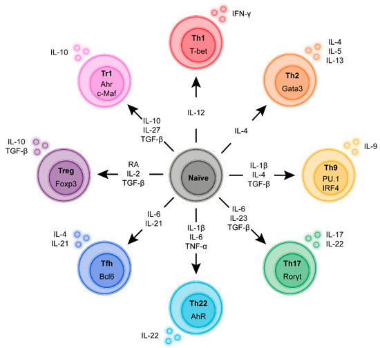During antigen-specific activation via the T-cell receptor (TCR) and subsequent proliferation in the lymph node naïve CD4+ T-cells undergo a functional programming termed differentiation. Depending on the strength of the TCR signal and in response to cytokine co-stimulation by the APC, T-cells express specific transcription factors that skew differentiation to a range of functionalities such as host defense against intracellular pathogens, defense against extracellular pathogens, defense against helminths or immune suppression. Although these differentiation programs are not irreversible, classification according to these “subsets” based on dominant cytokine profiles is commonly used to better describe and characterize immune responses. In 1986 it was first proposed to classify CD4+ T-cells into T helper 1 (Th1) cells and Th2 cells on the basis of their cytokine production [43]. Today, we discern at least seven T helper cell subsets: Th1, Th2, Th9, Th17, Th22, T follicular helper (Tfh) and several types of T-regulatory (Treg) cells (Figure 2) [44,45,46]. For most T-cell subsets, key transcription factors have been identified. Additionally, T-cell subsets are characterized by the expression of distinct members of the signaling transducer and activator (STAT) family. Moreover, depending on CD4+ T-cell activation, polarization, and differentiation, the chemokine receptor profile expressed by T helper cells is adapted, which in part is maintained in memory T-cells after the inflammatory response is resolved [47]. Below, we will briefly introduce these Th subsets.