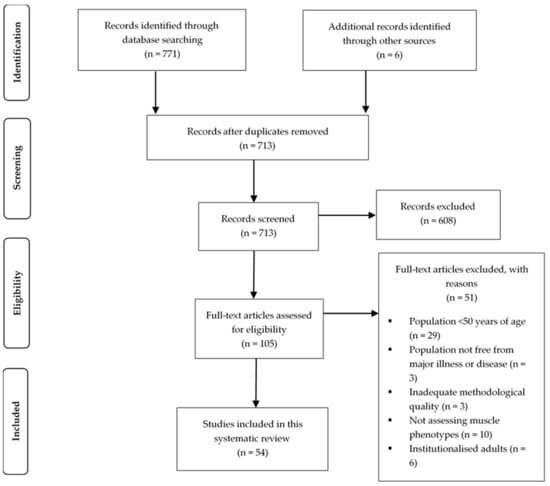 The systematic search of the online databases identified 771 papers. Following the addition of filters, removal of duplicates and screening for eligibility, 48 studies remained. Six additional articles were retrieved through the manual search of reference lists, leaving a total of 54 articles to be included in this systematic review. Figure 1 highlights the identification and selection process in accordance with the PRISMA statement.