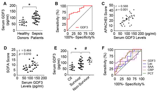 Higher serum levels of GDF3 are related to poor outcomes of septic patients. (A) Scatter plots of serum GDF3 levels on admission of healthy donors and septic patients. (B) AUC discriminating sepsis from healthy controls. (C,D) Correlation between serum GDF3 levels and (C) APACHE II score and (D) SOFA score at admission of ICU. (E) Serum GDF3 levels in different groups sorted by survivor and non-survivor. (F) AUROC predicting 28-day mortality: GDF3 (AUC 0.770), Lac (AUC 0.767), CRP (AUC 0.632), PCT (AUC 0.677), SAA (AUC 0.724). (*, p < 0.05 vs. healthy donors; #, p < 0.05 vs. survivor).