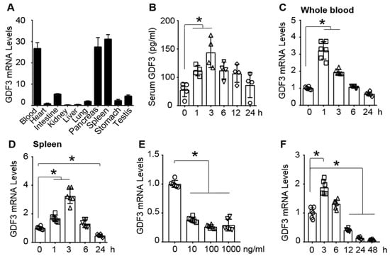 The dynamic expression of GDF3 in mice and macrophages treated with endotoxin. (A) mRNA levels of GDF3 in different tissues of mice, n = 4. GAPDH gene expression was used as the internal control. (B) Serum GDF3 levels are detected at indicated time points in mice after LPS (10mg/kg) injection (*, p < 0.05; n = 4). mRNA levels of GDF3 were determined in (C) whole blood and (D) spleens of LPS-injected mice (*, p < 0.05; n = 6). (E) LPS-dose response and (F) time course of GDF3 expression in BMDMs, where indicated, (E) total RNAs were collected at 24 h after LPS exposure (*, p < 0.05) and (F) BMDMs were pre-treated with LPS (10 ng/mL) (*, p < 0.05; n = 4). Similar results were obtained in other two independent experiments.