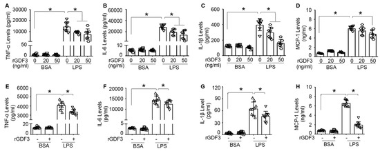 Recombinant GDF3 protein suppresses pro-inflammatory cytokine production in LPS-treated macrophages. (A–D) BMDMs treated with the indicated doses of recombinant GDF3 (rGDF3) and (E–H) RAW264.7 macrophages treated with rGDF3 (50 ng/mL) for 2 h, followed by addition of LPS (10 ng/mL) for 24 h. Culture supernatants were measured for (A,E) TNF-α, (B,F) IL-6, (C,G) IL-1β and (D,H) MCP-1 by ELISA (*, p < 0.05; n = 7–9 wells). Similar results were obtained in another separated experiments.