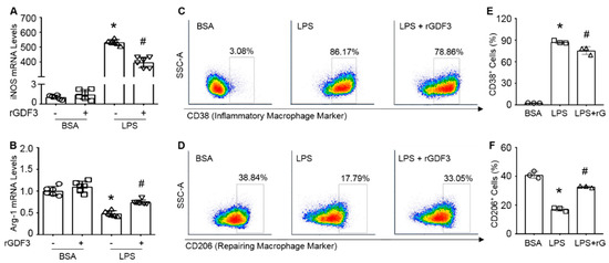 Recombinant GDF3 protein reduces macrophage M1 and increases M2 polarization in LPS-treated BMDMs. BMDMs were treated with rGDF3 (50 ng/mL) for 2 h, then added LPS (10 ng/mL) for 6 h. mRNA levels of (A) iNOS and (B) Arg-1 were evaluated by RT-PCR. The mRNA levels were normalized to 18S mRNA levels and expressed as fold versus BSA group (*, p < 0.05 vs. Ctl; #, p < 0.05 vs. LPS; n = 6). (C,D) BMDMs were treated with rGDF3 (50 ng/mL) for 2 h, followed by LPS (10 ng/mL) exposure for 12 h. These BMDMs were stained with antibodies to (C) CD38 and (D) CD206 for flow cytometry analysis. Quantification results for (E) CD38 positive macrophages and (F) CD206 positive macrophages. (*, p < 0.05 vs. BSA; #, p < 0.05 vs. LPS; n = 3). Similar results were obtained in other two separated experiments.