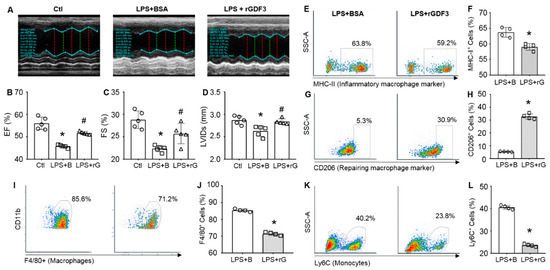 Administration of rGDF3 to LPS-mice improves cardiac function and promotes cardiac macrophage M2 phenotype. WT mice received recombinant GDF3 protein (I.P., 10μg/kg BW) 12 h prior to LPS injection (I.P., 10mg/kg BW), 12 h later cardiac function was measured by echocardiograph. (A) Representative M-mode echocardiography recordings for three groups, and (B) left ventricular ejection fraction (EF %), (C) fractional shortening (FS %) and (D) left ventricular internal dimension at end-systolic (LVIDs) were calculated (*, p < 0.05 vs. Ctl; #, p < 0.05 vs. LPS+B; n = 5). Cardiac cells were stained with antibodies to (E) MHC-II, (G) CD206, (I) F4/80 plus CD11b, (K) Ly6C for flow cytometry analysis and their respective quantification results are shown in (F,H,J,L). (*, p < 0.05; n = 4). Similar results were obtained in other two independent experiments.