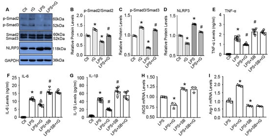To further determine whether GDF3-mediated suppression of LPS-induced inflammation and M2 polarization are dependent on the Smad2/3 activation, we pre-treated RAW264.7 macrophages with or without SB431542 (10μM), a specific inhibitor of Smad2/3, for 30 min, then incubated with rGDF3 (50 ng/mL) or BSA for 1 h, followed by stimulation with LPS (10 ng/mL) for 12 h. Cell supernatants were harvested to measure pro-inflammatory cytokine levels, using ELISA kits. As shown in Figure 7E–G, LPS-stimulated releases of TNF-α, IL-6, and IL-1β by macrophages were significantly inhibited by addition of rGDF3. However, such rGDF3-elicted inhibitory effects in LPS-macrophages were greatly offset by addition of SB431542, as evidenced by failure of exogenous GDF3 to reduce the levels of TNF-α, IL-6, and IL-1β in LPS-macrophages when pre-treated with SB431542 (Figure 7E–G). Moreover, expression levels of iNOS (M1 marker) were remarkably decreased, whereas mRNA levels of Arg1 (M2 marker) were dramatically increased in rGDF3-treated LPS-cells, compared to LPS-controls. When pre-addition of SB431542, however, such rGDF3-induced changes of macrophage phenotype were not observed (Figure 7H,I). Thus, these data suggest that GDF3 signaling through the Smad2/3-NLRP3 pathway is critical for macrophage M2 polarization with the associated inhibitory effects on endotoxin-caused inflammation.