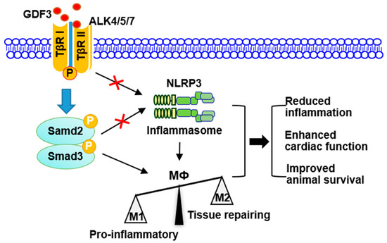 Scheme depicting GDF3-drived protection against endotoxin-induced inflammation, cardiac dysfunction and mortality. Exogenous GDF3 binds to ALK4/5/7 where activates Smad2/3 and inhibits NLRP3 inflammasome, consequently suppresses macrophage pro-inflammatory phenotype (M1), leading to reduced inflammation, cardiac dysfunction, and mortality in endotoxin-induced septic mice.