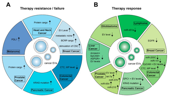 Approaches to monitor therapies by EVs and their cargo. Shown changes were associated with therapy resistance or failure (A) in contrast to changes seen if the cancer is responding to therapy (B) ↑: increase, upregulation; ↓: decrease, downregulation; EV level↑: Increase in EV concentration; miR: microRNA; CTC: circulation tumor cells; CSC: cancer stem-like cells; MP: microparticles.