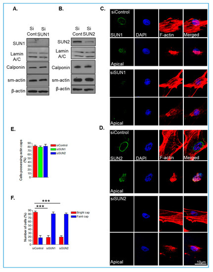 The above data demonstrate that SUN2 is more abundant in isolated human VSMCs than SUN1. Recent studies have shown that SUN1 and SUN2 possess specific functions at the NE, so we next investigated whether disruption of SUN1 or SUN2 individually influenced organisation of the actin cap, by employing an siRNA-mediated depletion strategy. WB confirmed efficient depletion of SUN1 and SUN2 after siRNA treatment in VSMCs (Figure 1A,B). We next assessed the impact of SUN1 or SUN2 depletion on levels of lamins A/C and the actomyosin contractile apparatus. qPCR analysis revealed that SUN1 and SUN2 depletion did not alter mRNA levels of smooth muscle actin (sm-actin), β-actin, or non-muscle-myosin II (NM-myosin II) (Supplementary Figure S3). WB confirmed that levels of lamins A/C and the actomyosin contractile proteins calponin, sm-actin, and β-actin remained unaltered in SUN1- and SUN2-depleted VSMCs (Figure 1A,B).