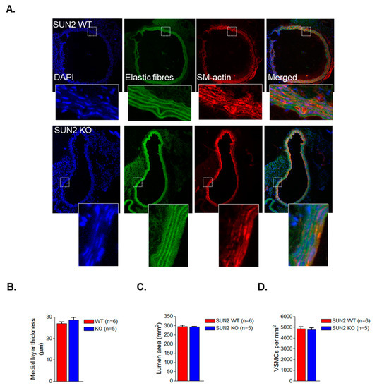 SUN2 KO aortae display normal VSMC organisation. (A) Representative IHC images of WT and SUN2 KO aortae stained with DAPI (blue), smooth muscle (sm)-actin (red), and the elastic fibre auto-fluorescence (green). Graphs show (B) medial layer thickness, (C) lumen area, and (D) VSMC number in WT and SUN2 KO aortae.