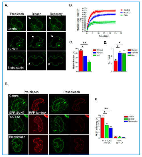 To analyse the impact of actomyosin on GFP-SUN2 mobility within the NE, we performed fluorescence recovery after photo bleaching (FRAP) analysis. Both blebbistatin and Y27632 treatment resulted in a reduction in GFP-SUN2 mobile fraction and an increase in T1/2, suggesting that actomyosin activity promotes SUN2 mobility in the NE (Figure 6A–D). Previous studies have shown that lamin A interacts with SUN2 and regulates the mobility of SUN2 in the INM [29]. Therefore, we next examined whether actomyosin activity influences the association between SUN2 and lamin A by performing acceptor photo-bleaching FRET analysis on VSMCs co-expressing GFP-SUN2 and RFP-lamin A. Similar to previous studies, GFP-SUN2 and RFP-lamin A had a FRET efficiency of around 7% in control VSMCs (Figure 6E,F). However, blebbistatin- and Y27632-treated VSMCs displayed a reduction in FRET efficiency between GFP-SUN2 and RFP-lamin A (Figure 6E,F).