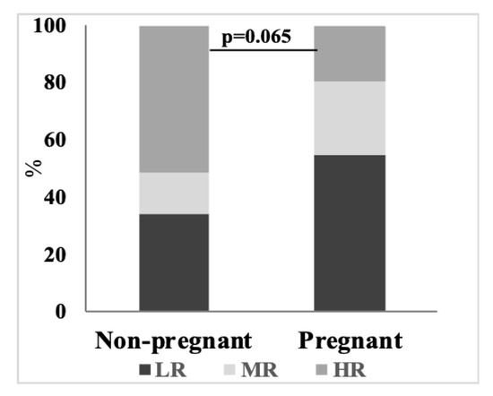 Distribution of the non-pregnant (n = 41) and pregnant (n =31) rats according to their relative resistance to acute hypobaric hypoxia. HR—highly resistant rats (dark-grey), spent under hypoxia ≥10 min; MR—medium resistant rats (light-grey), spent under hypoxia between 5 and 10 min; LR—low resistant rats (middle-grey), spent under hypoxia ≤5 min. % of each sub-group to total number of animals in the group is shown in shades of grey. The indicated p value is estimated using Fisher exact test.
