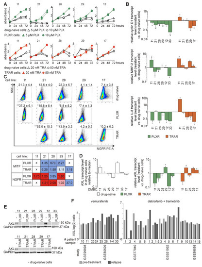 Melanoma cell lines resistant to vemurafenib (PLXR) or trametinib (TRAR) differ from their drug-naïve counterparts. (A) Proliferation curves of drug-naïve, PLXR and TRAR cells grown in the presence of drugs at indicated concentrations based on the activity of acid phosphatase. Representative results of triplicate experiment are shown; n = 3, except for 12_PLXR cells (n = 2). (B) Transcript levels of cyclin D1, MMP-2 and IL-8 assessed using qRT-PCR. Bars represent mean values of 3 biological replicates ±SD, except for 12_PLXR cells (n = 2). Differences are considered significant at * p < 0.05. (C) The percentages of nerve growth factor receptor (NGFR)-positive cells are increased while MITF-positive cells are decreased in the majority of melanoma cell populations. NGFR-positive cells are shown as representative density plots, and average percentages ±SD are shown. * p < 0.05, ** p < 0.01. Comparison of changes in the percentages of MITF-positive and NGFR-positive cells assessed by flow cytometry is shown in the table. The original data for MITF was published elsewhere [27]. The numbers indicate fold change, drug-resistant vs. drug-naïve cell populations. The results were color coded (red, fold increase; blue, fold decrease). (D) AXL transcript levels assessed using qRT-PCR. Left: transcript levels of AXL determined in drug-naïve cells relative to the median value in all seven cell lines. Right: expression of AXL assessed in PLXR and TRAR cell lines relative to its expression in matched drug-naïve cells. Bars represent mean values of 3 biological replicates ±SD, except for 12_PLXR cells (n = 2). Differences are considered significant at * p < 0.05. (E) Representative Western blot images showing AXL levels in drug-naïve and drug-resistant cell lines. GAPDH was used as a loading control. n = 2. (F) Analysis of AXL expression in tumor specimens collected from patients before treatment and post-relapse with resistance developed either to vemurafenib or combined treatment, dabrafenib and trametinib. Results are shown as log 2 ratios normalized to the mean intensity of pre-treatment specimens. Data were obtained from NCBI GEO (http://www.ncbi.nlm.nih.gov/geo/). Accession numbers are indicated.