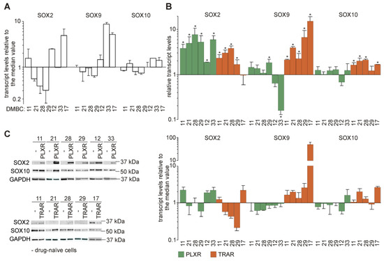 In addition to expression of AXL, NGFR and a lineage-specific transcription factor MITF, expression of SOX transcription factors that are associated with control of cancer cell plasticity, is broadly used to classify the phenotypes of melanoma cells [36,37]. First, the expression of SOX2, SOX9, and SOX10 at the transcript levels was compared between drug-naïve cell lines. SOX10 was quite uniformly expressed in all drug-naïve cell lines relative to the median value (Figure 2A). Transcript levels of SOX2 were below the median value in DMBC21, DMBC28, and DMBC29 cell lines, and markedly higher in DMBC11, DMBC12, and DMBC17 cells (Figure 2A). SOX9 expression was at a high level only in DMBC33 and DMBC17 cells (Figure 2A). SOX2 transcript levels were significantly elevated in all resistant cell lines, both PLXR and TRAR, compared with the transcript levels in the corresponding drug-naïve cells, except for 17_TRAR cell line (Figure 2B) that originally exerted the highest expression of this gene among drug-naïve cell lines (Figure 2A). Transcript levels of SOX9 and SOX10 were significantly higher in TRAR cell lines compared with the levels in their drug-naïve counterparts, except for SOX10 expression in 29_TRAR cell line (Figure 2B). In PLXR cells, expression of SOX9 and SOX10 was at the similar levels as in drug-naïve cells, and only SOX9 transcript was significantly lower in 33_PLXR cells and significantly higher in 29_PLXR cells. More pronounced enhancement of SOX9 expression in TRAR cells than in PLXR cells was clearly visible when gene expression in each resistant cell line was related to the median value (Figure 2B, lower panel). At the protein level, SOX2 level markedly differentiated drug-naïve cell lines from their resistant counterparts, especially PLXR cell lines (Figure 2C). The protein level of SOX10 remained unaltered during development of resistance, except for resistant cells derived from DMBC21 cell line, in which SOX10 protein levels were substantially increased (Figure 2C).