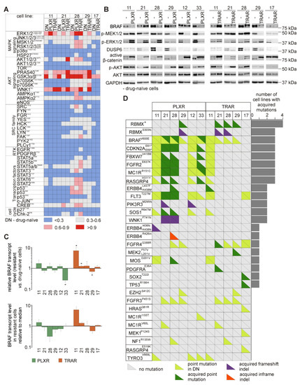 Melanoma cells resistant to vemurafenib (PLXR) or trametinib (TRAR) differ from their drug-naïve counterparts in activities of the main signaling pathways, which might be partially explained by acquired mutations. (A) Differential activation of key signaling molecules from drug-naïve (DN) and drug-resistant (PLXR, TRAR) melanoma cells assessed by phospho-profiling. The graph shows relative levels of phospho-proteins, for which mean pixel densities were normalized to HSP60 level. Red and blue colors indicate high- and low-level phosphorylation, respectively. (B) Western blots showing differences in expression of BRAF, DUSP6, and AKT and phosphorylation of MEK1/2, ERK1/2, β-catenin, and AKT. GAPDH was used as a loading control. n = 3, except for 12_PLXR cells (n = 2). (C) BRAF transcript levels were assessed using qRT-PCR. Upper part: expression of BRAF in PLXR and TRAR cell lines relative to its expression in the matched drug-naïve cells. Bars represent mean values of 3 biological replicates ±SD, except for 12_PLXR cells (n = 2). Differences are considered significant at * p < 0.05. Lower part: transcript levels of BRAF determined in drug-resistant cells relative to the median value. (D) Color coded diagram of mutations acquired during the development of resistance. Mutations in genes encoding proteins of the MAPK, PI3K/AKT, RTK, and cell cycle pathways are included. See Table S1 for non-mutated genes. All mutations (SNPs and InDELs) are ranked according to the number of resistant of cell lines, in which they were detected. RBMX *: G379R+/−, Y357H+/−, S337N+/−, R339G+/−, R324P+/−.