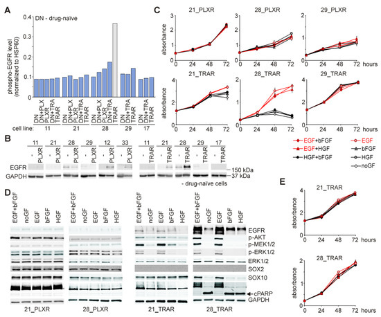 We have already reported that melanoma cells do not depend on exogenously provided growth factors, EGF, basic fibroblast growth factor (bFGF) and hepatocyte growth factor (HGF), and lack of them in the culture medium do not affect cell morphology and activity of several signaling pathways in patient-derived melanoma cells [25]. In this study, analysis of genetic material from resistant cells revealed several acquired mutations in genes encoding receptors of growth factors, especially FGFR (Figure 3D). To investigate growth factor dependence of PLXR and TRAR cell lines, selected resistant cells were grown either without exogenously added growth factors (noGF) or in the presence of EGF, bFGF, and HGF provided as single factors or in combination. Although de novo mutations in the gene encoding epidermal growth factor receptor (EGFR) that lead to a constitutive activity of the corresponding receptor were not found in resistant cells (Table S1), a phospho-protein array revealed a substantial increase in the level of active phospho-EGFR in 28_TRAR cells compared with matched drug-naïve cells treated with 50 nM trametinib (Figure 3A and Figure 4A). To check whether this phenomenon is solely related to the receptor activation or it is also associated with different expression of EGFR, the protein level of EGFR was assessed by immunoblotting. All drug-naïve cell lines were characterized by almost undetectable EGFR expression. EGFR protein level was the most markedly increased in 28_TRAR cells (Figure 4B), which indicates that both, expression and activity of EGFR were enhanced in this cell line during the development of resistance. Proliferation curves of PLXR cell lines were overlapping when comparing cell behavior in different growth factor cocktails, including noGF conditions (Figure 4C). TRAR cell lines exerted more variable response to growth factors. 29_TRAR cells (Figure 4C) and 17_TRAR cells (not shown) did not develop dependence on any growth factor. A slight influence of lack of exogenously added EGF on proliferation of 21_TRAR cells was visible after 72 h (Figure 4C). In contrast, lack of EGF in the culture medium resulted in substantial reduction of a viable cell number in 28_TRAR cell line already after 48 h (Figure 4C).