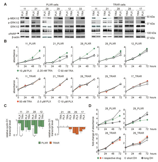BRAFV600E melanoma cell lines (DMBC11, DMBC12, DMBC21, DMBC28, DMBC29 and DMBC33) derived from six different tumor specimens were used to develop resistance to vemurafenib (PLX), whereas to obtain melanoma cell lines resistant to trametinib (TRA), in addition to BRAFV600E melanoma cell lines, one Harvey rat sarcoma viral oncogene homolog (HRASQ61R) cell line (DMBC17) was employed. After 4–5 months of continuous exposure to increasing concentrations of PLX and TRA finally reaching 10 µM and 50 nM, respectively, six PLX- (11_PLXR, 12_PLXR, 21_PLXR, 28_PLXR, 29_PLXR, and 33_PLXR) and five TRA-resistant cell lines (11_TRAR, 21_TRAR, 28_TRAR, 29_TRAR, and 17_TRAR) were obtained. None of two attempts to obtain 12_TRAR and 33_TRAR was successful. 33_PLXR cell line derived from DMBC33, which originally exerted very high doubling time (107.7 h) [22], although viable for several weeks did not proliferate efficiently enough to perform all experiments, and 12_PLXR survived only for a few weeks.