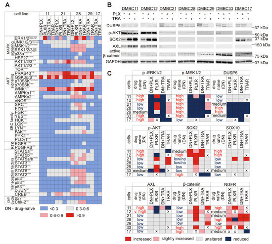 Phosphorylation status of the majority of proteins was similar in both settings (Figure 6A). These results combined with the results of immunoblotting (Figure 2C, Figure 3B and Figure 6B [27]) demonstrated that only a few proteins exerted different phosphorylation status or were differentially expressed, as summarized in Figure 6C. ERK1/2 phosphorylation while suppressed by short treatment [27], was elevated in several of drug-resistant cell lines (Figure 6C). Phosphorylation status of AKTS473 also diverse in drug-naïve cells (Figure 6B), mostly remained unaltered during immediate response, but was substantially changed in the majority of drug-resistant cell lines in cell line- and drug-dependent manner (Figure 6C). Phosphorylation of MEK1/2, which was reduced by short exposure to vemurafenib or trametinib [27], was also reduced in the majority of resistant cell lines, however, an opposite effect was also found in selected, especially TRAR cell lines (Figure 6C). β-catenin activity was enhanced in almost all resistant cell lines, whereas after short treatment this activity was mostly unaltered (Figure 6B,C). In summary, resistant cells responded to drugs with different activities of ERK1/2, AKT and β-catenin than their drug-naïve counterparts, whereas MEK1/2 activity was differentially changed almost exclusively in TRAR cell lines and SOX2 expression was differentially changed only in PLXR cell lines compared to their matched drug-naïve cell lines. DUSP6 expression was reduced already during short treatment, and these effects were kept at the similar level in the resistant cell lines. No effects were found for SOX10, except for 21_PLXR and 21_TRAR cell lines, in which SOX10 was markedly elevated (Figure 6C). AXL expression remained undetectable in the majority of cell lines, however, in AXLhigh drug-naïve cells short treatment slightly induced expression of AXL, whereas development of resistance reduced the level of this protein. During development of resistance to vemurafenib or trametinib, NGFR signaling was either significantly suppressed (28_PLXR and 17_TRAR cells), remained unchanged (29_TRAR) or was significantly enhanced (all other resistant cell lines), whereas during immediate response the percentages of NGFR-positive cells were increased in all melanoma cell lines although to different extent (Figure 6C).