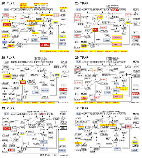 Diverse patterns of resistance showing patient- and drug-specific differences between drug-naïve and drug-resistant melanoma cells. The profiles summarizing alterations in the major signaling pathways were prepared for selected cell lines. The scheme showing changes in all resistant cells lines along with methods of data acquisition is provided as Figure S2. Color coded overview comparing investigated cell lines in terms of differences between drug-naïve and drug-resistant cells. Red/pink, strong/weak enhancement; blue, inhibition; red/blue frame and font, enhancement/inhibition shown only in phospho-profiling; dotted frame smaller in size, weak level/activity in drug-naïve cells; bold frame, high level/activity in drug-naïve cells; mutations acquired by resistant cells are marked in red, and those already present in drug-naïve cells are marked in black. Changes, which were already induced during immediate response to drugs are in the grey background, whereas changes unique for resistant cells (including mutations) are in the yellow background.