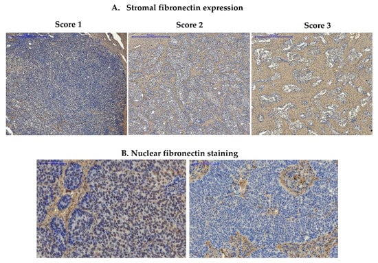 Immunohistochemical detection of fibronectin in ovarian cancer samples. (A) Images show representative examples of stromal fibronectin staining, scored as 1 (weak expression), 2 (moderate expression), and 3 (strong expression); (B) Images show a representative example of nuclear staining in cancer cells (image on the left) and lack of nuclear staining in cancer cells (image on the right); Pannoramic 250 Flash II Scanner, scale bar: 500 µm (upper panel) and 100 µm (lower panel).