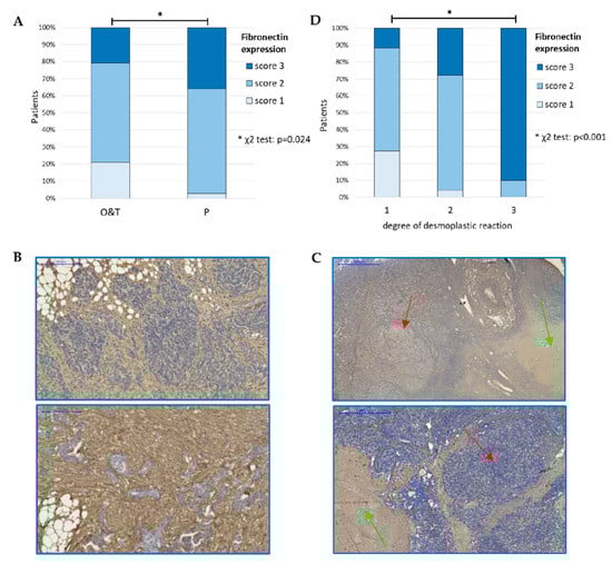(A). Correlation between fibronectin expression and the anatomical source of tumor specimen (χ2 test, p = 0.024) p—samples derived from peritoneal/omental metastatic disease; O—primary tumors (samples containing visible ovarian structures); T—samples containing only tumor tissue; (B). Examples of specimens derived from omental metastatic disease (P) with strong fibronectin expression; (C). Examples of specimens containing ovarian structures (O), green arrows indicate whitish corpuscles, red arrows indicate nests of cancer cells; (D). Correlation between fibronectin expression and the degree of desmoplastic reaction (χ2 test, p < 0.001). *—denotes p < 0.05.