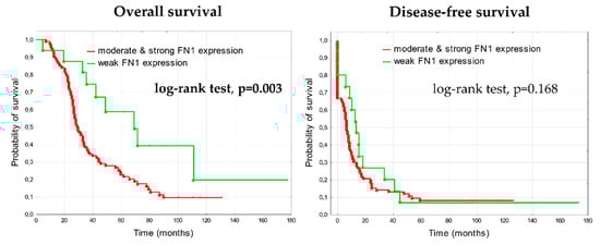 In the analysis of clinical outcome, patients with higher fibronectin expression (score 2 or 3) demonstrated significantly shorter overall survival than patients with weak (score 1) fibronectin expression (log-rank test, p = 0.003) (Figure 3). The median overall survival was 67 months in the group with weak expression of fibronectin (4.8–177.8 months, lower quartile 35 months, upper quartile 100 months), whereas in the group with higher expression of fibronectin the median overall survival was 29 months (7.3–131 months, lower quartile 23 months, upper quartile 57.5 months). The difference in relation to DFS was not statistically significant between groups (the median DFS was 13.6 months in group with weak fibronectin expression and 6.8 months in group with higher fibronectin expression).