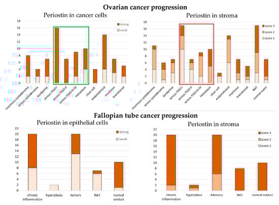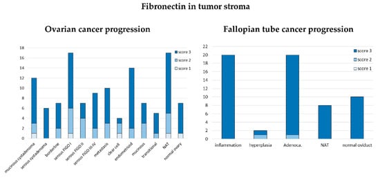 Our results support previous indications that fibronectin and periostin are associated with a shorter survival of patients. In addition, we have proposed the joint FN1&POSTN score as an independent prognostic factor for OS. We also analyzed, using tissue arrays, whether these proteins show differential expression in different stages and distinct histological types of ovarian cancer, as well as in healthy and benign ovarian tissues. As it is postulated that serous cancers may have either ovarian or fallopian origin, we used arrays containing samples of both organs, including normal tissue, inflammatory states, benign and borderline tumors, and cancer. These experiments showed that elevated expression of fibronectin and periostin was more common in fallopian than in ovarian cancers. The elevated expression of fibronectin and periostin was also associated with the source of ovarian tumor sample: more samples with a higher expression of these proteins were among samples derived from omental metastatic disease than among other samples.