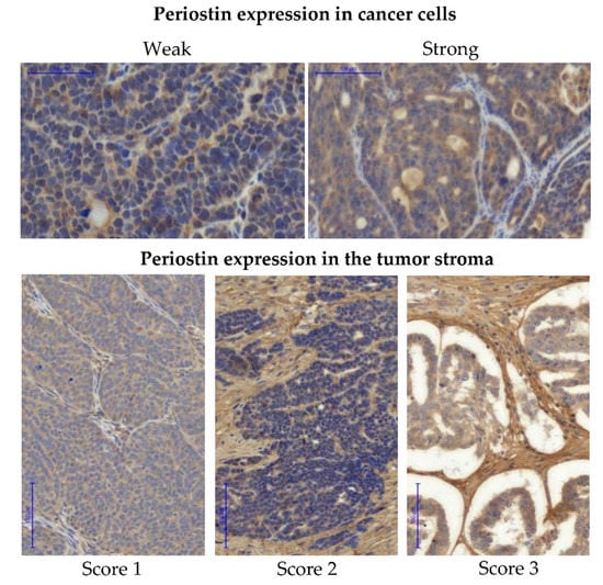 Immunohistochemical detection of periostin. Periostin expression was evaluated separately in cancer cells (upper panel) and in the tumor stroma (lower panel). Images show IHC staining in cancer cells scored either as “weak” or “strong” and IHC staining of stromal periostin scored 1–3. Pannoramic 250 Flash II Scanner, scale bar: 50 µm and 100 µm.