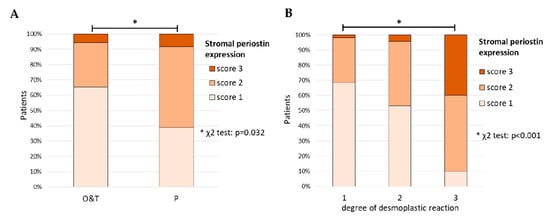 (A) Correlation between periostin expression and the anatomical source of tumor specimen (χ2 test, p = 0.032). P—samples derived from peritoneal/omental metastatic disease; O—primary tumor samples (containing visible ovarian structures); T—samples containing only tumor tissue; (B) Correlation between stromal periostin expression and the degree of desmoplastic reaction (χ2 test, p < 0.001). *—denotes p < 0.05.