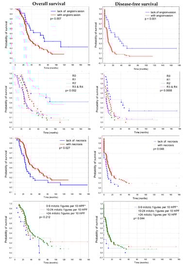 Subsequently, we found that patients who had tumors with angioinvasion demonstrated shorter survival in comparison to patients whose tumors showed no signs of angioinvasion (log-rank test, p = 0.007 for OS, p < 0.001 for DFS). Median OS was 50.53 for patients without angioinvasion and 29.76 for patients with angioinvasion in their tumors. Median DFS was 19.98 months and 6.35 months, respectively. Interestingly, patients with necrotic tumors had longer survival than patients with tumors without necrosis (log-rank test, p = 0.027 for OS, p = 0.048 for DFS). Median OS was 34.37 and 24.5 month, respectively, while median DFS was 8.5 months, respectively [32]. The mitotic activity of cancer cells correlated only with DFS. Patients with increased mitotic activity had longer DFS than patients with lower mitotic activity (χ2 test, p = 0.044). Other factors such as age, the accumulation of TP53, type of tumor growth, inflammatory infiltrate, presence of calcifications, and degree of desmoplasia showed no correlation with survival (Supplementary Figure S4).
