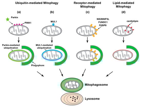 Mitophagy (mitochondrial autophagy) is the only known cellular pathway through which entire mitochondria are completely eliminated within lysosomes. Under physiological conditions, mitophagy plays an essential role in the basal mitochondrial turnover and maintenance. More importantly, mitophagy can also be robustly induced in response to a variety of pathological stimuli [7,25,26,27]. There are a number of mitophagy pathways that have been identified (Figure 1).