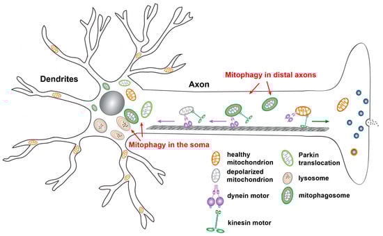 Neurons are highly polarized cells with unique properties in structure and function. Mitochondrial quality control mechanisms that efficiently sense and eliminate mitochondria damaged over usage, aging, or disease could be critical for neuronal health. Mitophagy is currently believed to constitute the major cellular pathway for mitochondrial quality control in neurons. While basal mitophagy is known to be required for the maintenance of neuronal homeostasis, mounting evidence has shown that mitophagy can be upregulated in response to various pathological stimuli (Figure 2). Cardiolipin-mediated mitophagy can be induced in primary cortical neurons treated with the mitochondrial complex I inhibitor rotenone [67]. As for Parkin-mediated mitophagy, Δψm dissipation triggers Parkin translocation onto depolarized mitochondria in neurons after treatment with CCCP, an Δψm uncoupler [72,73]. Interestingly, Parkin-targeted mitochondria primarily accumulate in the somatodendritic region of neurons where they undergo autophagic sequestration for lysosomal degradation. Moreover, mitophagy activation reduces anterograde transport, but increases retrograde transport of axonal mitochondria, suggesting that damaged mitochondria are trafficked back to the soma for mitophagic clearance. Parkin-dependent mitophagy was also discovered under AD-linked pathophysiological conditions in the absence of any Δψm dissipating reagent [74]. The spatial aspects of Parkin-dependent mitophagy were also observed in vivo. In particular, the PINK1 and Parkin mutant Drosophila exhibit abnormal tubular and reticular mitochondria restricted to the cell body, as well as normal morphology with reduced mitochondrial flux within axons [46,47]. In addition to Drosophila, the evidence from examination of Purkinje neurons in the mito-QC reporter mice suggests that the majority of mitochondrial turnover occurs in the Purkinje somata. This supports the view that damaged mitochondria or mitophagosomes are returned to the cell body for lysosomal clearance [75]. Collectively, these in vitro and in vivo observations consistently suggest that the soma is in the focus of neuronal mitophagy, a selective process with a function to restrict damaged mitochondria to the soma and thus limit the impact of impaired mitochondrial function on distal axons.