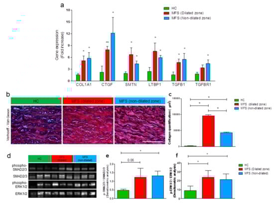 To characterize TAA in MFS, we collected bioptic samples from dilated and non-dilated aorta of patients undergoing aortic replacement. MFS specimens were compared with thoracic aortic samples of HC. We evaluated the expression of principal genes involved in MFS disease by using total RNA extracts from the ascending aortic tissues. qRT-PCR analyses showed an upregulation of genes encoding several pro-fibrotic factors, such as collagen I (COL1A1) and connective tissue growth factor (CTGF) in aortic MFS patients’ samples vs. HC (Figure 1a). Similar results were obtained for SMTN, a gene encoding the typical VSMC marker smoothelin, and genes related to TGF-β1, such as TGFB1 itself, type 1 TGF-β receptor (TGFBR1), and latent TGF-β binding protein 1 (LTBP1).