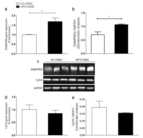 Then, qRT-PCR and Western blot analyses on VSMC ascribed the responsibility for EMMPRIN overexpression to these cells (Figure 3a–c). Similarly to tissue results, no statistical differences in CyPA expression levels (Figure 3c–e) were detected between HC- and MFS-VSMC.