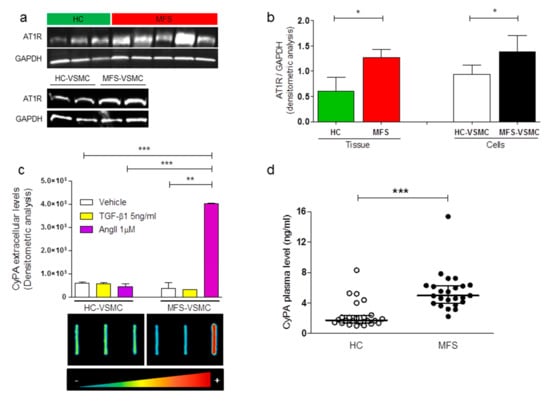 3.3. MFS-VSMC Show A Higher Expression of AT1R, an Enhanced Secretion of CyPA, and MFS Patients Display Higher Plasmatic CyPA Levels