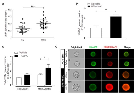 Results showed that CyPA (100 ng/mL) treatment led to a significant overexpression of EMMPRIN gene (Figure 5c) in MFS- vs. HC-VSMC. Concerning EMMPRIN protein levels, the ImageStreamX analysis confirmed the EMMPRIN localization on VSMC membranes and further highlighted the EMMPRIN overexpression after CyPA treatment, specifically on cell membranes of MFS-VSMC (Figure 5d).