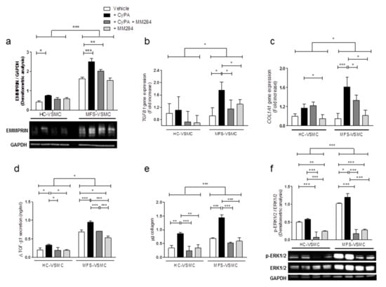 Firstly, we confirmed by Western blot that the CyPA treatment significantly increased the EMMPRIN protein expression levels both in HC- and MFS-VSMC. Secondly, we observed that CyPA inhibition restored EMMPRIN levels to those of untreated conditions selectively in MFS-VSMC (Figure 6a). Thirdly, 100 ng/mL of CyPA treatment upregulates TGFB1 and COL1A1 gene expression levels exclusively in MFS-VSMC, while CyPA inhibitor limited these gene expression levels to the same values of untreated conditions (Figure 6b,c). These effects were further confirmed also in protein expression levels, since MM284 (250 ng/mL) notably limited CyPA-mediated effects on TGF-β1 and collagen protein expression (Figure 6d, e). At last, the same experimental conditions were adopted to detect the in vitro activation of ERK1/2 signaling. Also, in this case, MFS-VSMC showed an overall upregulation of this pro-fibrotic pathway in comparison with HC-VSMC, the CyPA treatment further enhanced phospho-ERK1/2 expression levels, while MM284 (250 ng/mL) mitigated CyPA effects in this signaling pathway stimulation (Figure 6f).