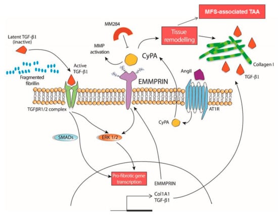 It is nowadays well established that MFS condition is strongly associated with the activation of TGF-β canonical (SMAD2/3) and non-canonical (ERK1/2) pathways which, in turn, lead to the upregulation of downstream genes. Moreover, several studies reported the capability of EMMPRIN as CyPA receptor in activating ERK1/2 signaling pathway [,,].