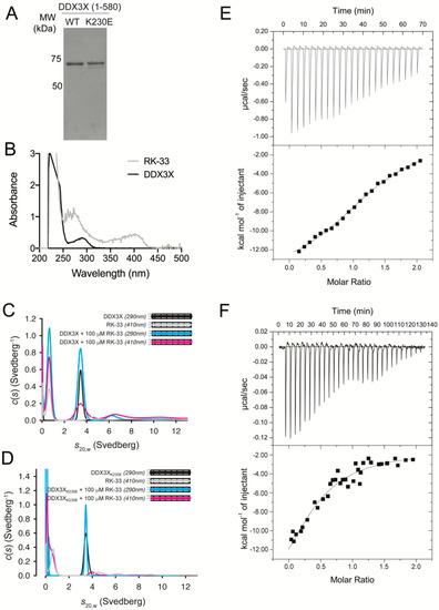 RK-33 directly binds to DEAD-box helicase 3 X-linked (DDX3X) residue K230. (A) Coomassie-stained SDS-PAGE of purified recombinant wild-type and K230E DDX3X. (B) Wavelength scans of 200–500 nm collected in the analytical ultracentrifuge on purified recombinant DDX3X alone (black) and 100 μM RK-33 (gray). Sedimentation velocity studies of RK-33 binding to (C) DDX3X or (D) DDX3X K230E. c(s) distributions from fits to data collected at 290 and 410 nm were plotted as a function of s20,w for DDX3X in the presence of 100 μM RK-33 at 290 nm (blue) and 410 nm (pink), 100 μM RK-33 alone (410 nm, gray) and DDX3X with an equivalent % dimethyl sulfoxide (DMSO) (DDX3X alone, 290 nm, black). The residual plots are shown in insets. Data in (C,D) are each representative of two independent experiments. (E,F) Calorimetry studies of RK-33 binding to DDX3X. RK-33 at (E) 50 μM and (F) 200 μM was injected into DDX3X (17 μM) in the sample cell. Data were fit to a one-site binding model. The stoichiometry deduced from data fitting to the two experiments was 1.05 ± 0.2, with a Kd of 33 ± 2 μM and ΔH of −19 ± 0.3 kcal/mol. Reported values represent the average of the two experiments, with average errors of the fits to the experimental data reported by Origin 7.0.