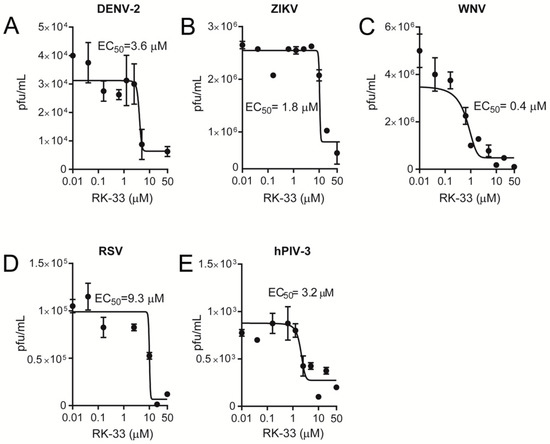 Since RK-33 has only been tested for its anticancer properties, we tested its ability to limit infection by key members of the Paramyxoviridae (RSV and hPIV-3) and Flaviviridae (WNV, DENV-2, ZIKV) families. Vero cells were infected at an MOI of 1 with RSV [34], hPIV-3, DENV-2 [30,35], ZIKV [32,35] or WNV [35], followed 2 h later by the addition of increasing concentrations of RK-33. Then, 22 h later, virus production was quantified by plaque assays and qRT-PCR analysis of the cell supernatant (DENV-2, ZIKV, WNV, hPIV-3) and cell lysates (RSV). Strikingly, RK-33 potently inhibited not only DENV-2, ZIKV and WNV (Figure 3A–C) but also RSV and hPIV-3 replication (Figure 3D,E), with EC50s of ≤10 μM (see Table 1 for pooled data). These results were consistent with qRT-PCR analysis indicating that RK-33 inhibited all viruses with comparable EC50 values (Figure 4, Table 1).