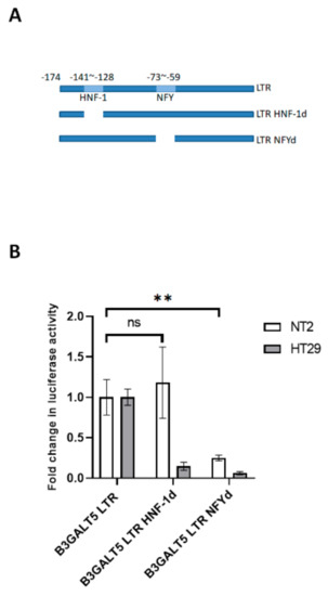 Transcription factors involved in B3GALT5-LTR expression. (A) The positions of the canonical HNF1- and NFY-binding sites on the B3GALT5-LTR promoter are shown. (B) Expression of the Luc-LTR reporter construct with a deleted HNF-1 binding site in its promoter (HNF-1d) did not change in NT2 cells but was reduced in HT29 cells. Luciferase activity was greatly reduced when NT2 and HT29 cells were transfected with Luc-LTR with a deleted NFY binding site (NFYd). (**, p < 0.01 and ns: not statistically significant).