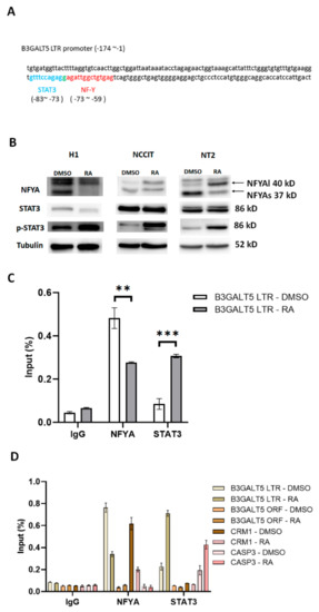 NFYA and STAT3 bind to the B3GALT5 promoter. (A) The positions of the canonical NFYA- and STAT3- binding sites in the B3GALT5-LTR promoter as predicted by the JASPAR database [38]. (B) Expression of NFYA isoforms and the STAT3 phosphorylation status in RA-treated ES and EC cells. Phosphorylation of STAT3 was markedly enhanced after RA treatment. Expression of NFYAs was reduced by RA treatment of ES and EC cells, and NFYAl expression was induced in EC cells but not in ES cells. Tubulin served as the loading control for these Western blots. (C) NFYA and STAT3 bound to the B3GALT5-LTR promoter as shown by chromatin immunoprecipitation (ChIP) assays in NT2 cells. NFYA bound to the B3GALT5-LTR promoter in undifferentiated NT2 cells (DMSO-treated cells) to a greater extent than in differentiated cells (RA-treated cells). STAT3 bound to the B3GALT5-LTR promoter in differentiated but not undifferentiated NT2 cells. One percent of the chromatin is labeled as input from each sample. (**, p < 0.01; ***, p < 0.001) (D) NFYA and STAT3 bound to the B3GALT5-LTR promoter as shown by ChIP assays in H1 cells. NFYA bound to the B3GALT5-LTR promoter in undifferentiated H1 cells (DMSO-treated cells) to a greater extent than in differentiated cells (RA-treated cells). STAT3 bound to the B3GALT5-LTR promoter in differentiated H1 cells to a greater extent than in undifferentiated cells. CRM1 promoter contains a NFYA binding site [39] that is used as a positive control for NFYA binding, and CASP3 promoter contains a STAT3 binding site [40] that is used as a positive control for STAT3 binding. B3GALT5 open reading frame is used as a negative control for NFYA and STAT3 binding.