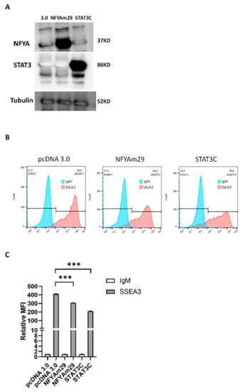 NFYAm29 and STAT3C repress SSEA3 synthesis in 2102Ep cells. (A) Overexpressed NFYAm29 and STAT3C were detected by western blotting. Tubulin served as the loading control. 3.0 means empty vector pcDNA 3.0. (B) Flow cytometry showing the amounts of SSEA3 on 2102Ep cells after transfection with pcDNA 3.0 or NFYAm29 or STAT3C. (C) Relative mean fluorescence intensity (MFI) after staining for SSEA3. The synthesis of SSEA3 was significantly reduced in cells transfected with pcDNA 3.0 containing the NFYAm29 or STAT3C sequence compared with cells transfected with an unmodified pcDNA3.0 (control) (***, p < 0.001).