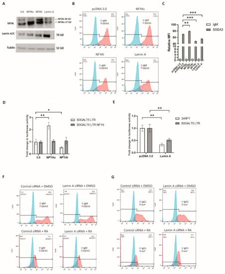 NFYAs and NFYAl have different transcriptional activities [41], as they activate or repress different genes during muscle cell differentiation [42]. Overexpression of NFYAs enhanced SSEA3 expression and B3GALT5-LTR promoter activity, while overexpression of NFYAl repressed SSEA3 and B3GALT5-LTR promoter activity (Figure 5A–C). Activation by NFYAs or repression by NFYAl was diminished after deletion of the NFY-binding site on the B3GALT5-LTR promoter (Figure 5D). The amount of NFYA and its activity is decreased by lamin A [43,44], and lamin A is an ES cell differentiation marker [45]. Lamin A was downregulated by RA treatment of NCCIT and H1 Oct4-EGFP cells (Figure S5A). Overexpression of lamin A repressed the activities of the NFYA responsive element and the B3GALT5-LTR promoter (Figure 5E). The expression of NFYAs and SSEA3 was also repressed by lamin A (Figure 5A,B). RA-mediated repression of SSEA3 and sialyl Lewis a expression were partially reversed by lamin A siRNA (Figure 5F,G, and Figure S6A,B showing KD efficiency).